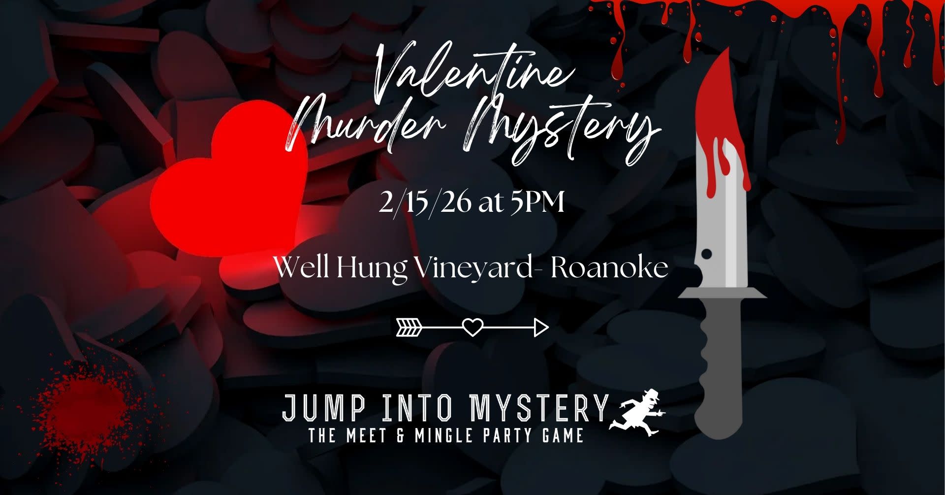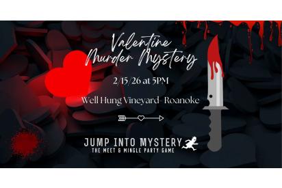 Join Jump into Mystery on Sunday 12/15/26, at 5pm for a Valentine themed whodunnit at Well Hung Vineyard, in Roanoke, VA. This will be an interactive murder mystery event where you will play a character, solve clues, and interrogate all of the suspects. You will laugh, talk, eat, and drink. Make new friends while you decide who committed the crime, using your detective skills. Early bird tickets are $30 per person through 1/4/26 and will then be $35 per person. Food and wine will be available for purchase but are not included in the ticket. Everyone will get their character role at the event. Everyone in your group will need a separate ticket to attend and tickets are non-refundable. This is an adults only event. All participants are asked to please arrive and check in between 4:30pm and 4:45pm to grab food and drinks, as the game will start promptly at 5pm.
