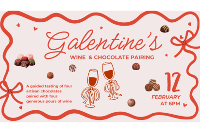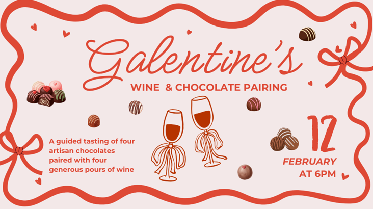 We’re hosting a Galentine’s chocolate and wine pairing with four delicious chocolates and four generous pours of wine. It’s relaxed, fun, and a great excuse to get out of the house for something a little different.